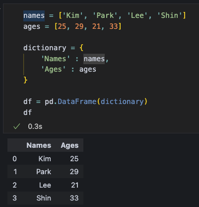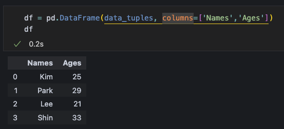 위에서 생성한 data_tuples 리스트를 가지고 데이터프레임을 위와 같이 생성했습니다. Names라는 컬럼명, 그리고 Ages라는 컬럼명을 가진 4행 2열의 데이터프레임이 생성되었습니다.