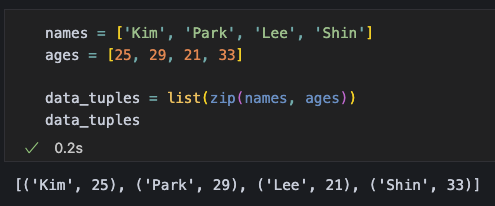 names 와 ages 라는 두 개의 리스트들을 zip 함수를 통해 엮어서 tuple 형태의 리스트로 만들어보았습니다.