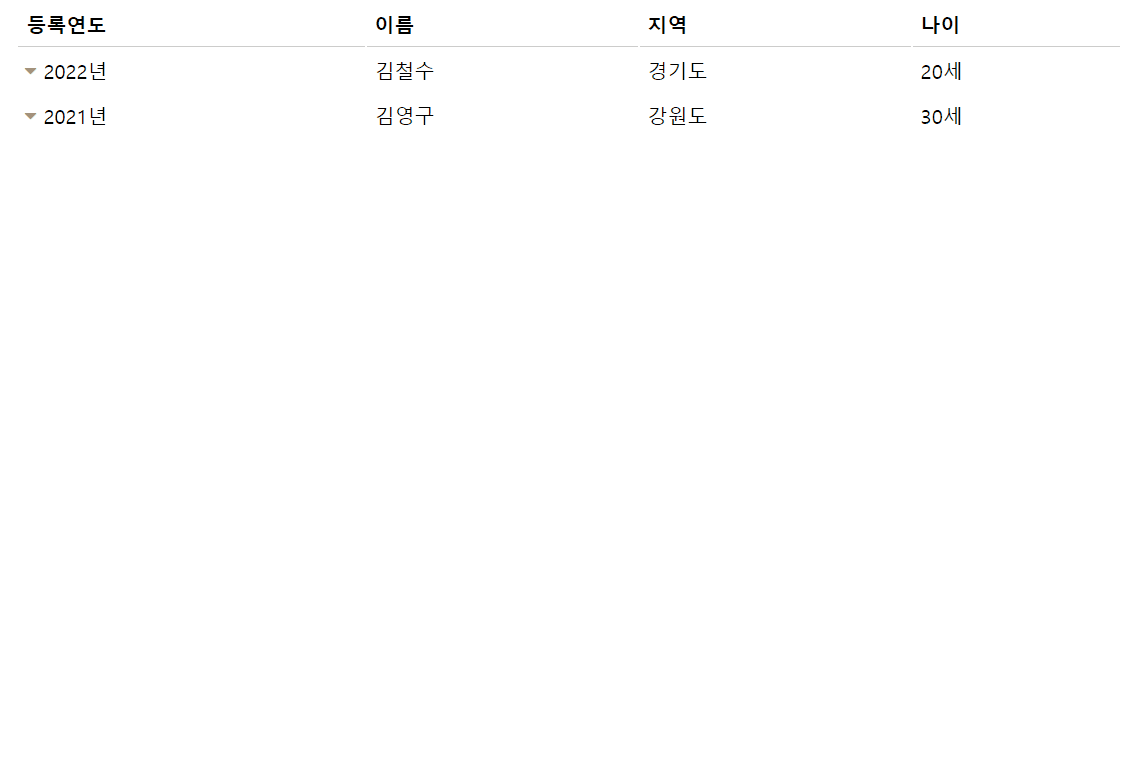 첫번째와 두번째 행 클릭 시 상세내용이 펼쳐져 응시일, 과목, 점수를 나타내는 내부 테이블이 보입니다. 클릭했던 행을 다시 클릭하면 접히는 것을 확인할 수 있습니다. 마치 하나의 행처럼 보이는데 그 안에 또다른 테이블이 들어가져있죠?