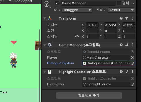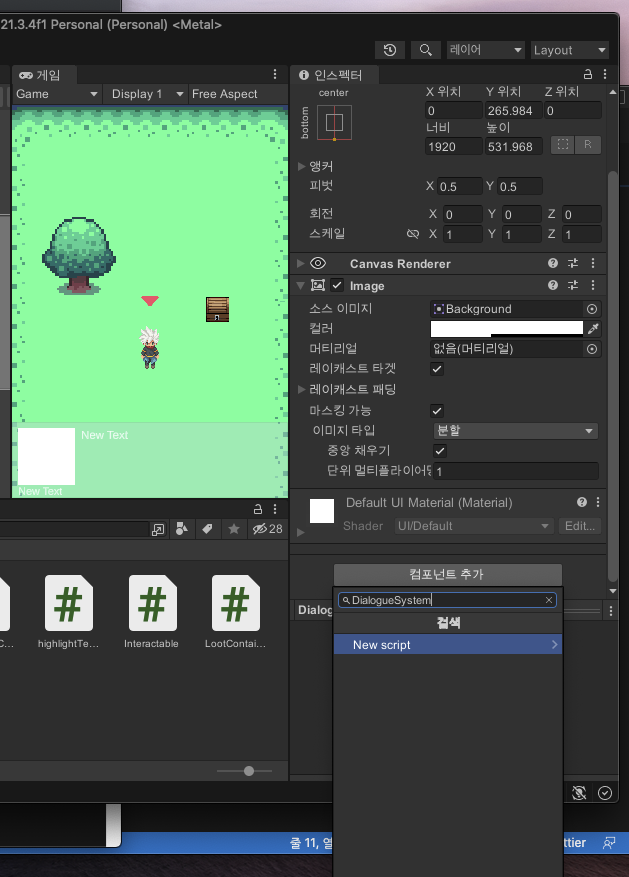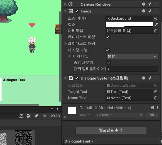 그 다음, 다이얼로그 시스템을 컨트롤하기 위해 패널에서 DialogueSystem이라는 스크립트를 생성해서 컴포넌트 추가해줍니다.