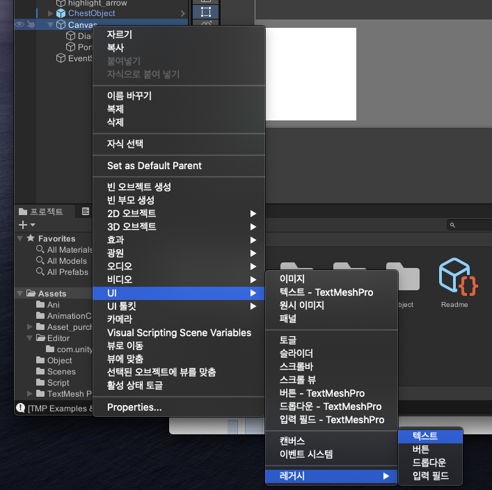 추가적으로 npc의 이름과 대화 내용을 넣을 텍스트를 같이 생성하겠습니다. (UI - 레거시 - 텍스트)