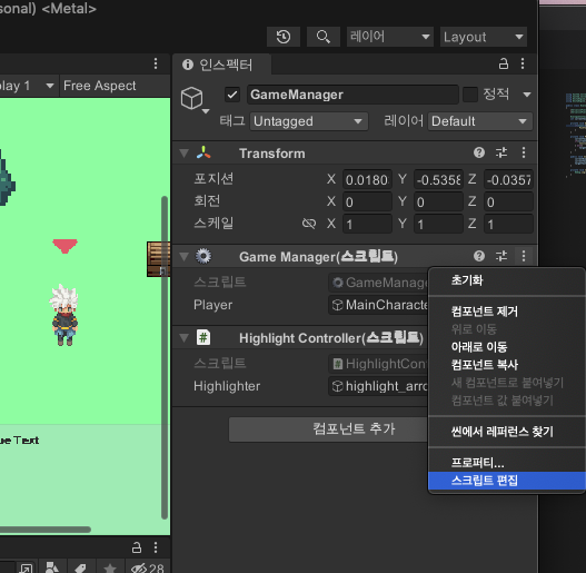 이제 계층구조의 Gamemanager에서 Gamemanager스크립트를 수정하겠습니다.