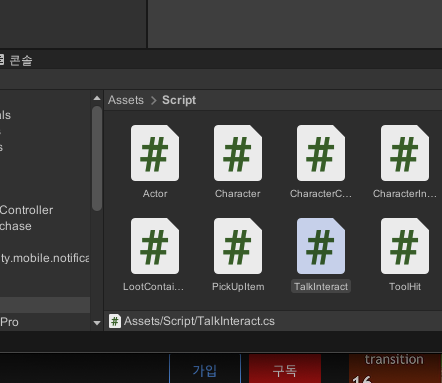 (TalkInteract는 기존 포스팅된 예제에서 정의한 Interat를 상속하는 스크립트 입니다. 앞의 예제를 참고해주세요!)