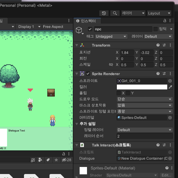 새로 넣거나 사용할 기존 오브젝트에 collider가 없다면 boxCollider2D 를 추가해주시고, 캐릭터와 상호작용을 위해 TalkInteract라는 스크립트를 생성해서 새 컴포넌트로 추가해줍니다.
