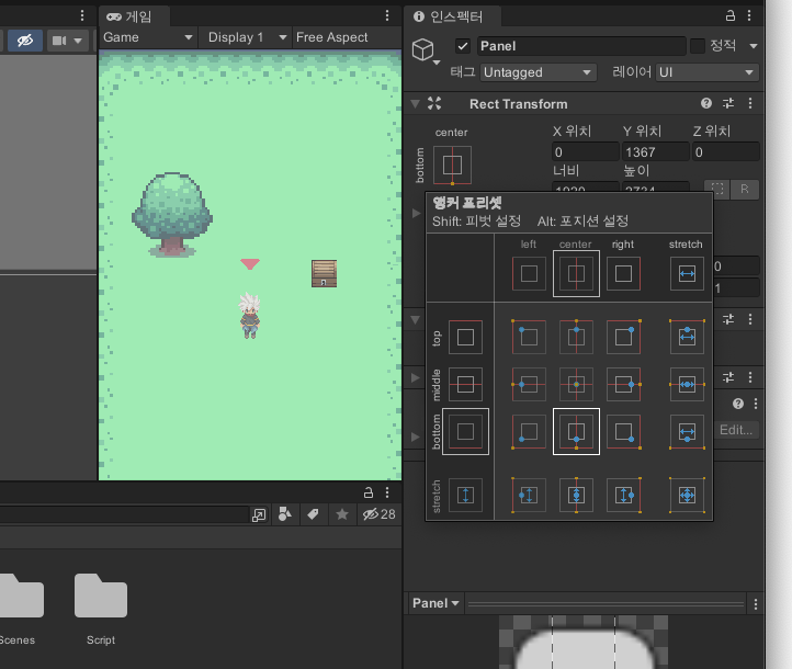 패널의 이름을 변경해주고 앵커 프리셋을 게임 대화상자가 나올 위치대로 잡아줍니다. 저는 botton - center로 하겠습니다.