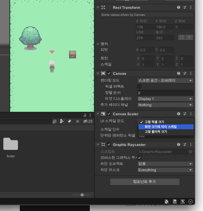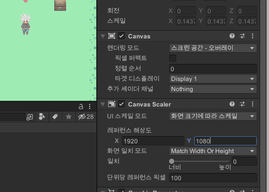 그 다음 같이생성된 canvas의 Scaler에서 스케일 모드 수정과 해상도를 변경해줍니다.