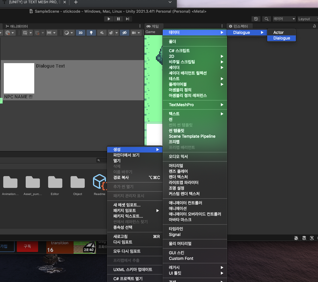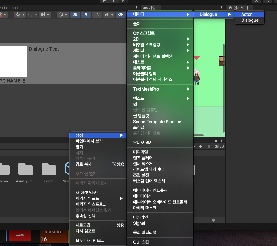 마우스 오른쪽 클릭 - 생성 - 데이터 - Dialogue - Dialogue 와 Actor를 각각 생성하겠습니다.