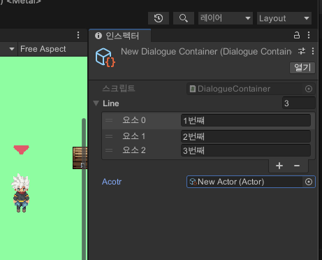 그리고 DIalogue 에서 출력할 대화를 Line- 요소에 입력하고 Actor 필드를 앞에 먼저 생성한 Actor로 지정합니다.