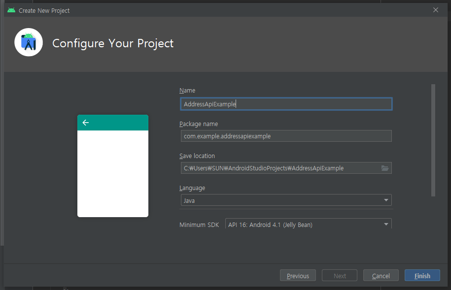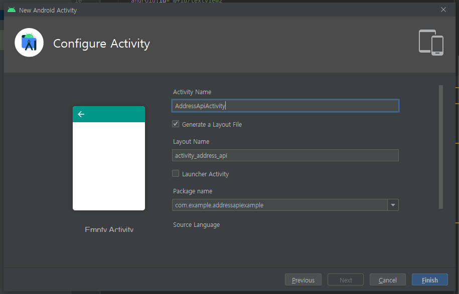 다음과 같이 주소 액티비티를 생성해줍니다.