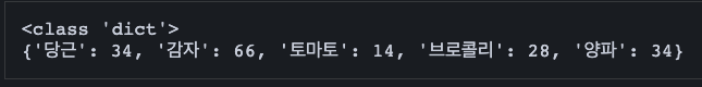 vege_dict = {'당근':34, '감자':66, '토마토':14, '브로콜리':28, '양파':34}
