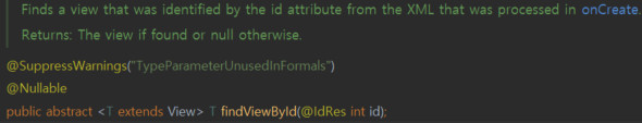 액티비티의 인플레이트 된 xml 레이아웃에는 해당 view의 id를 찾을 수 없으므로 null을 반환하게 됩니다.