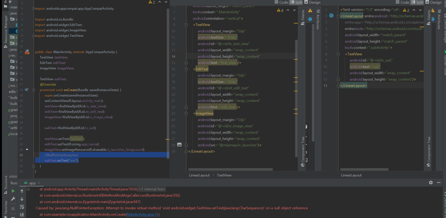 null을 발생하던 activity_sub.xml 에 요소들을 참조할 수 없습니다.