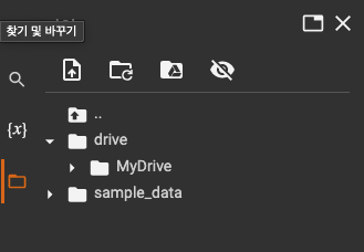 허용을 하게 되면 왼쪽의 이미지와 같이 drive 폴더가 보이게 되고, colab 상에서 코드로 접근이 가능해집니다.
