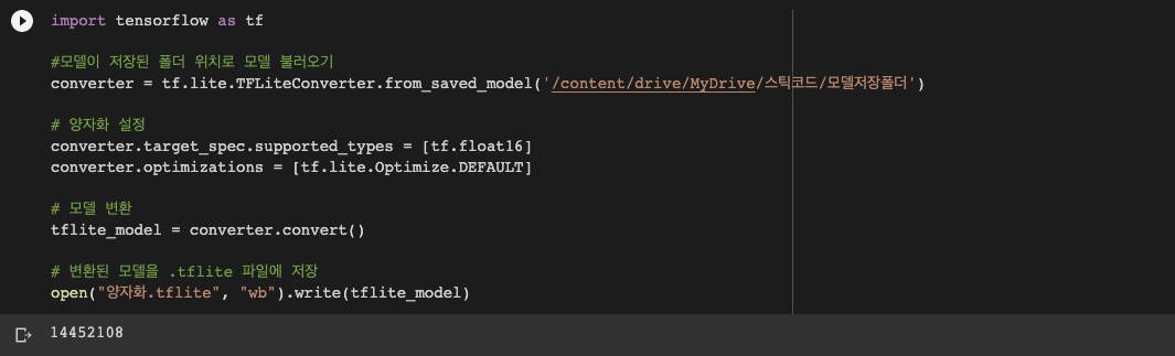 converter = tf.lite.TFLiteConverter.from_saved_model('변환할 모델이 있는 폴더경로')