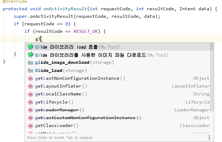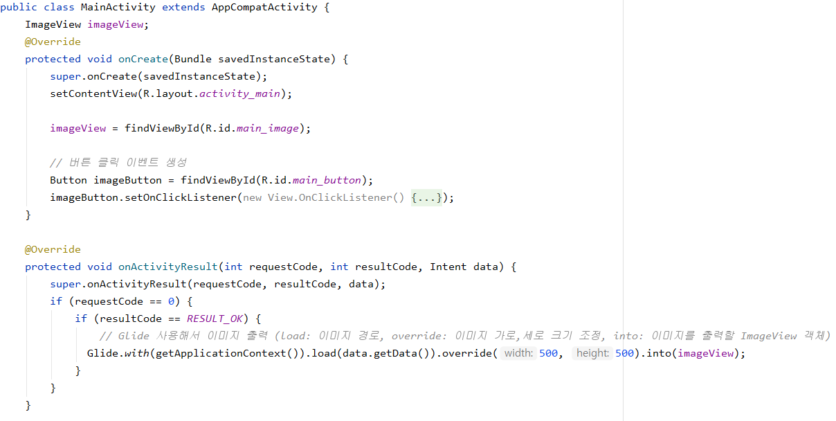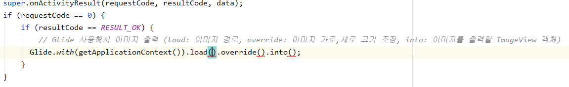 다음은 선택한 이미지를 화면에 보여주기 위해 'Glide 라이브러리 load 호출'를 클릭합니다.
