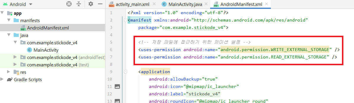 다음 AndroidManifest.xml 파일 안에 파일을 불러오기 위한 권한을 추가해줍니다.