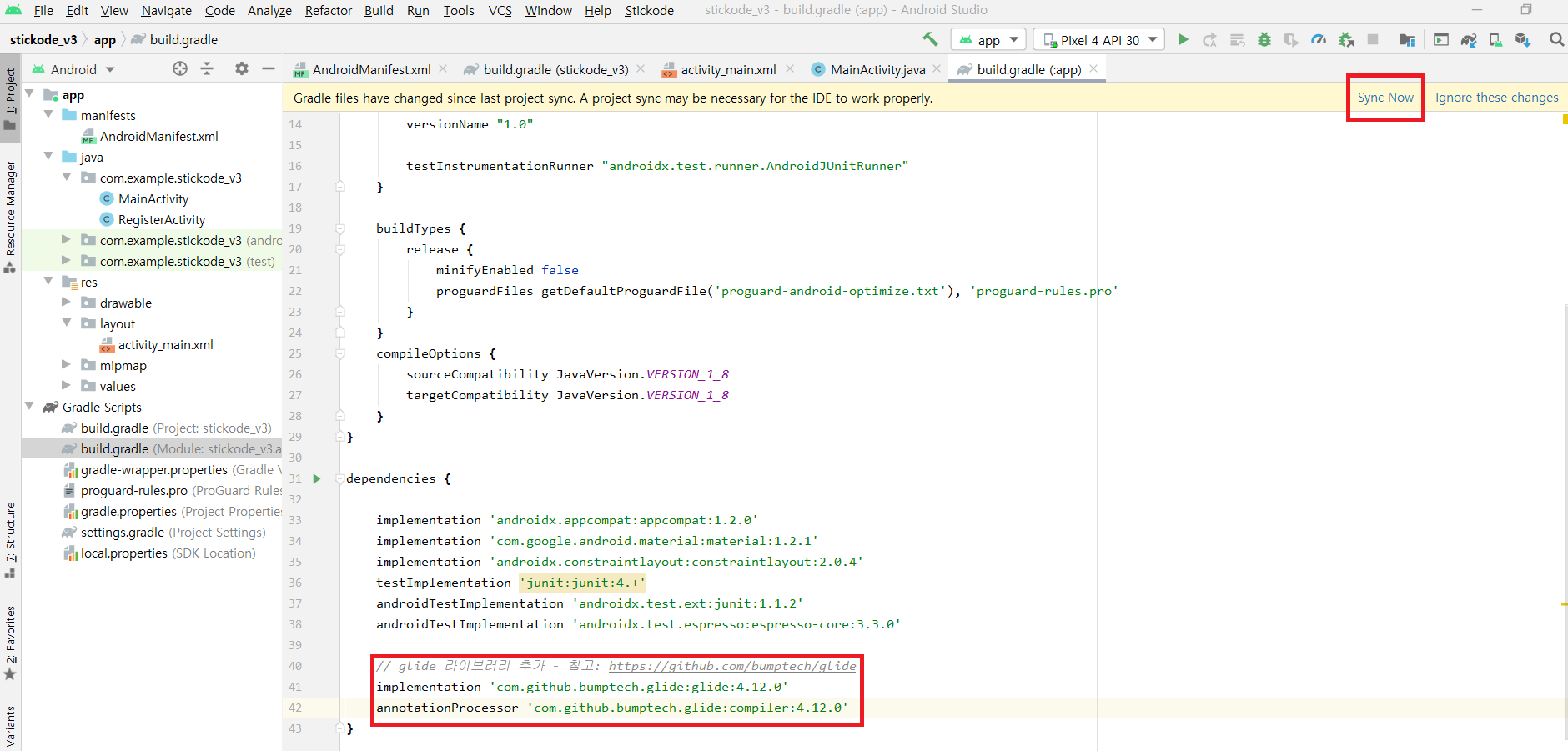 먼저, build.gradle 파일안에 Glide라는 라이브러리를 사용하기 위해 아래 화면처럼 추가합니다.