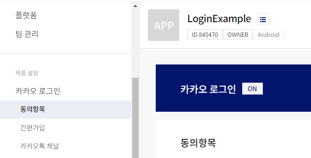 내 어플리케이션 -> 제품 설정 -> 카카오로그인 에 들어가 상태를 On으로 변경해줍니다.