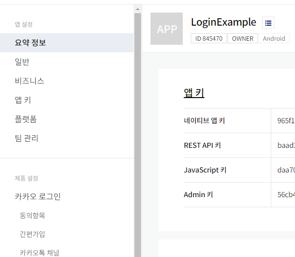 어플을 등록하면 아래와 같은 앱키를 확인할 수 있습니다.