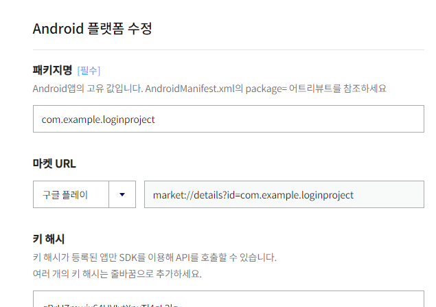 본인의 프로젝트명을 입력하고 키해시를 입력해줍니다.
