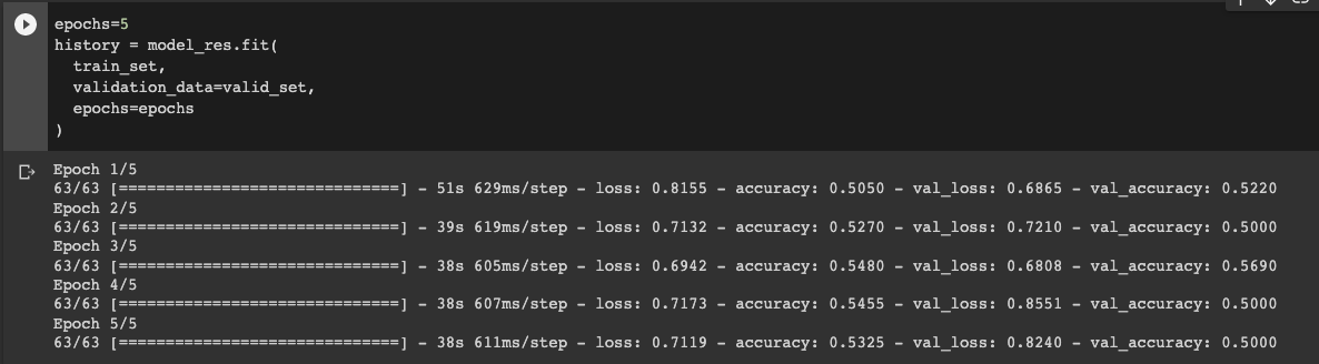 지금은 가장 기본적인 flatten과 Dense(2) 를 붙여보겠습니다. 마지막은 항상 클래스의 개수만큼 설정하시면됩니다.