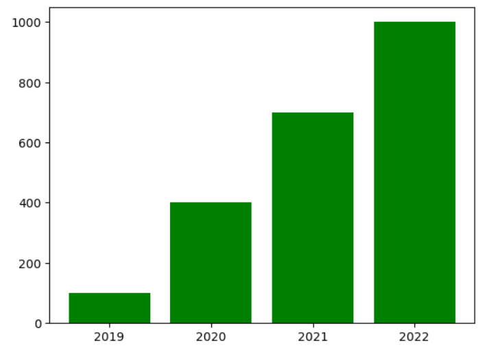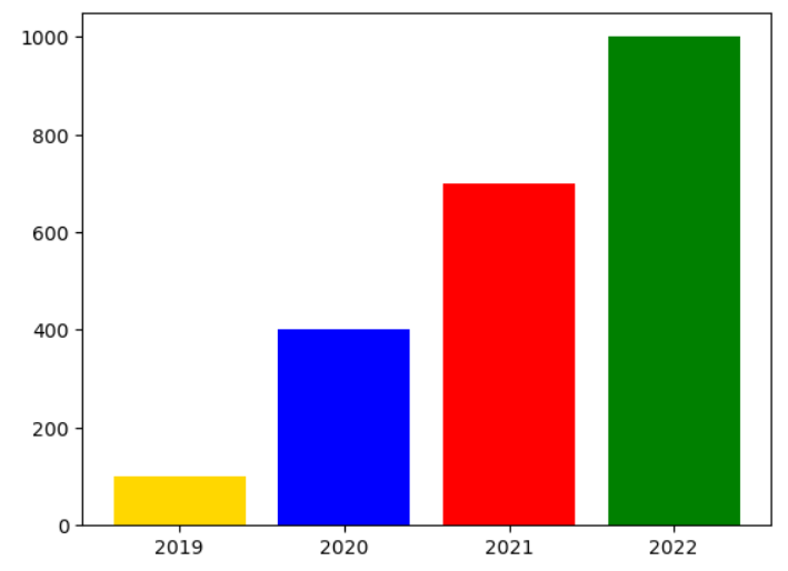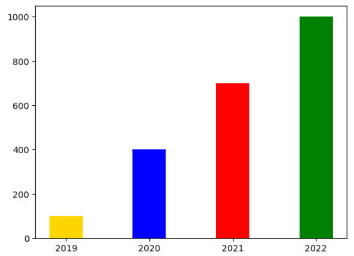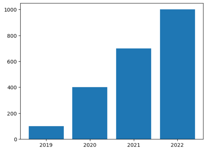 plt.bar() 함수에 x 값 [100, 400, 700, 1000]와 y 값 ['2019', '2020', '2021', '2022']를 입력해주고 실행시키면