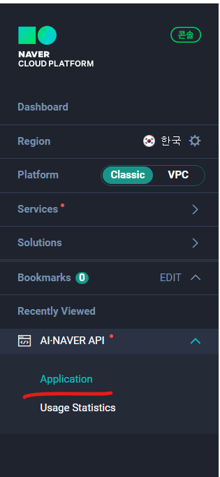 (2) AI NAVER API의 하위의 Application에 들어갑니다.
