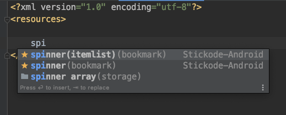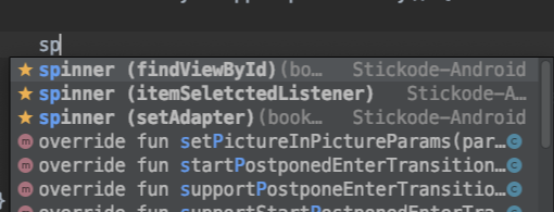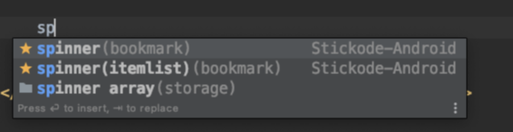 스틱코드를 이용하면 "sp" 두 글자만 작성해도 spinner가 아래 사진처럼 보기에 나옵니다.