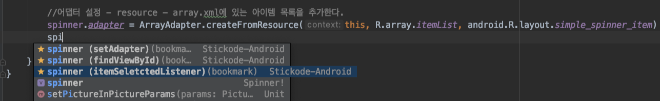 이때는 위와 똑같이 "spinner"를 입력하면 하단 보기에 spinner(setAdapter)가 보입니다.