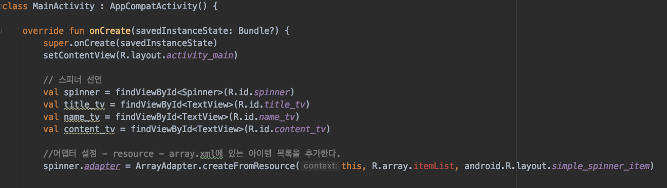 클래스에서 spinner를 findViewById로 선언해줍니다.