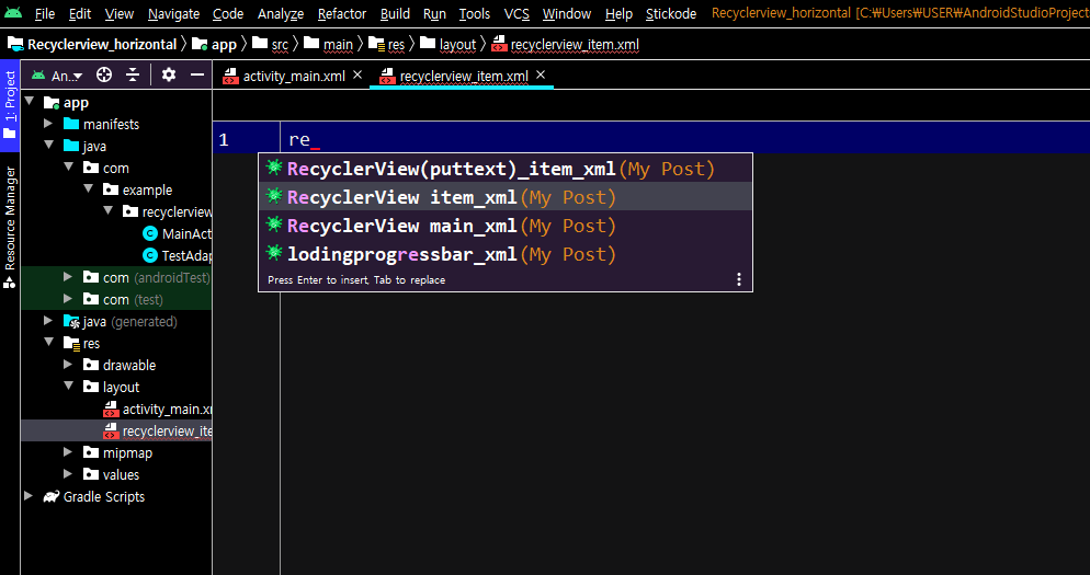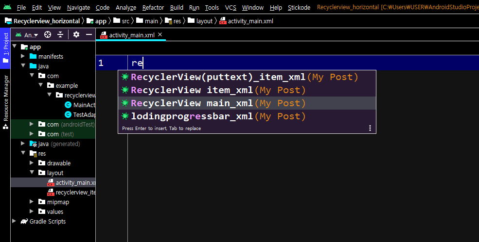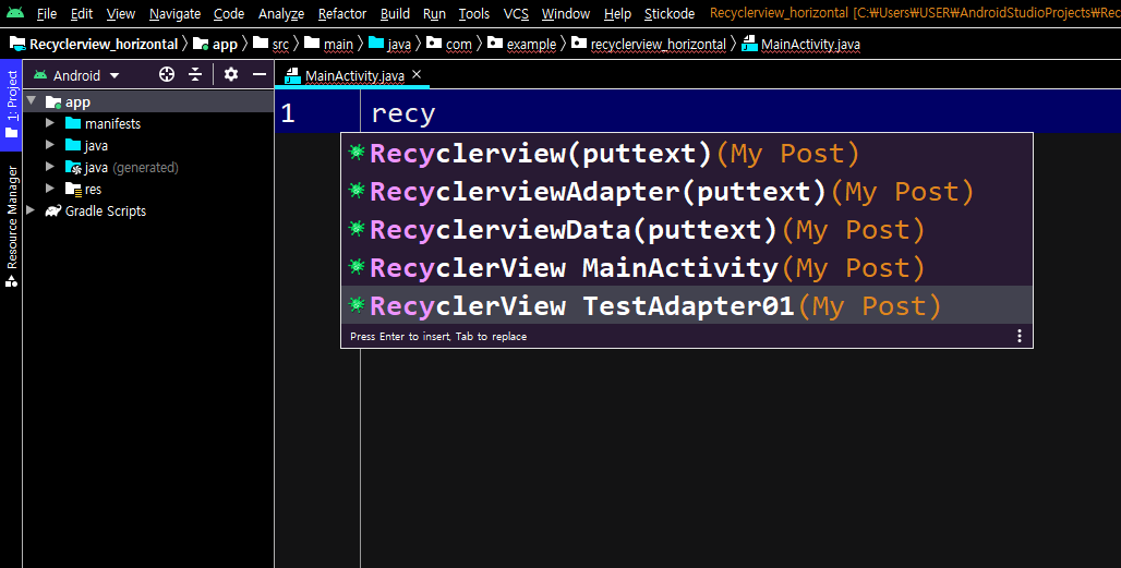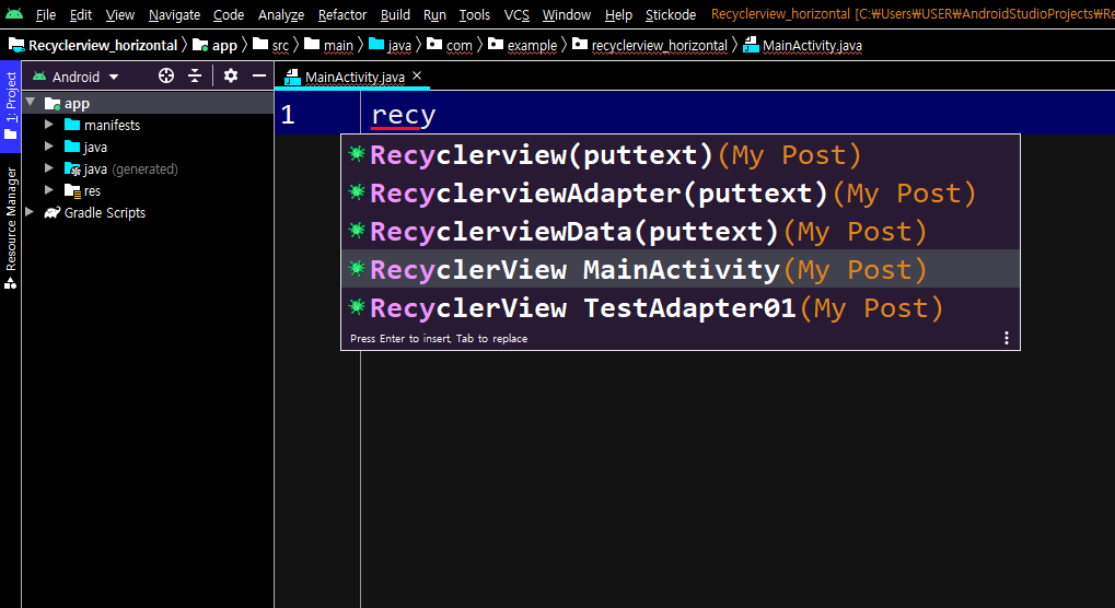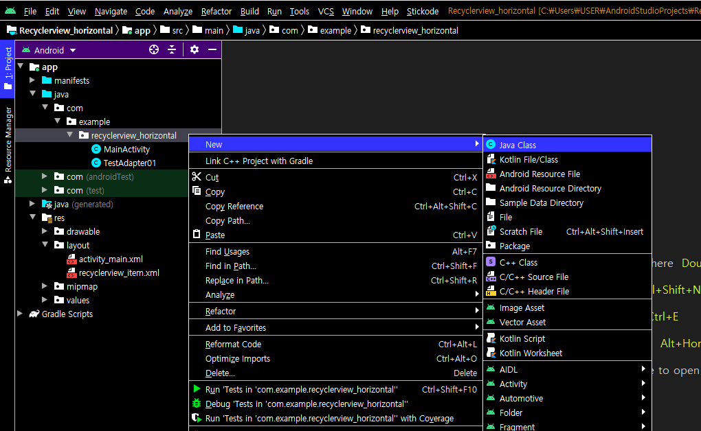 예제에서 프로젝트 제목은 recyclerview_horizontal 로 하였습니다.