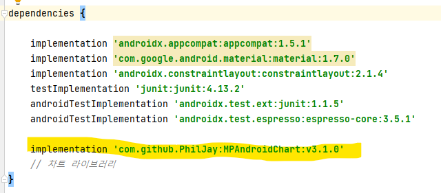 implementation 'com.github.PhilJay:MPAndroidChart:v3.1.0'