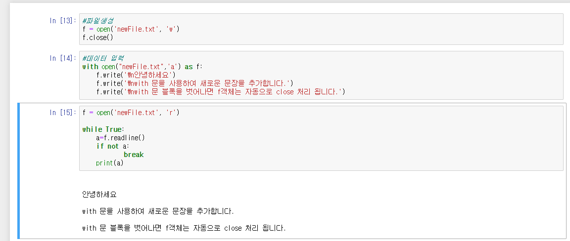 f.write('\nwith 문 블록을 벗어나면 f객체는 자동으로 close 처리 됩니다.')