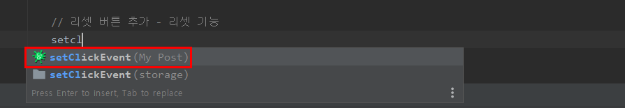 스틱코드를 사용하여 리셋 버튼에 클릭 이벤트를 만들어주고 걸음수를 초기화 하는 기능을 넣어줍니다.