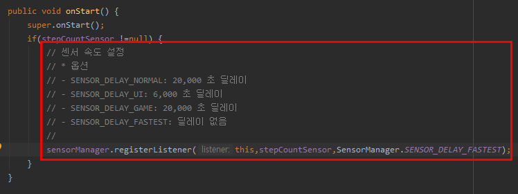sensorManager.registerListener(this,stepCountSensor,SensorManager.SENSOR_DELAY_FASTEST);
