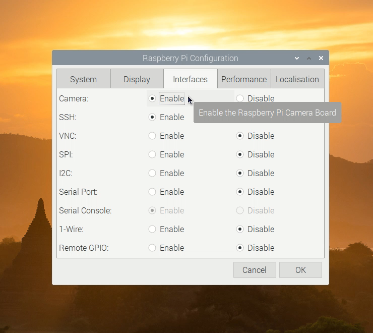 전원을 연결하고, 설정에 들어가 카메라 소프트웨어를 활성화합니다.