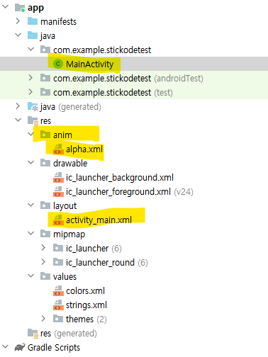 위 애니메이션을 구현하기 위해서는 다음과 같은 파일을 만들어줘야 합니다.