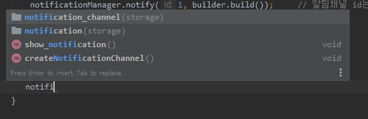 알림채널 생성 코드와 알림 띄워주는 코드는 스틱코드에 저장해놓은 코드를 불러와 빠르게 작성해보았습니다.