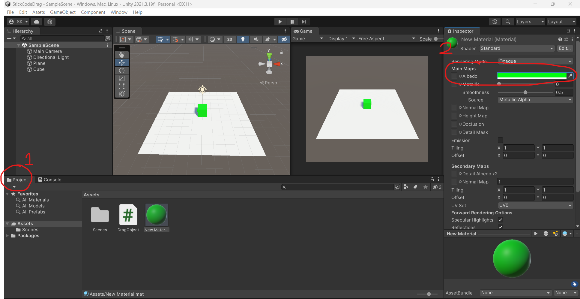 이제 하단 Project창으로 가 마우스 우클릭을 한 뒤 Create -> Material을 생성하고 해당 Material 클릭 후 우측 Inspector 창에서 Albedo 속성 우측 색상 바를 클릭하고 바닥인 흰색과 구분되는 색으로 변경해줍니다.