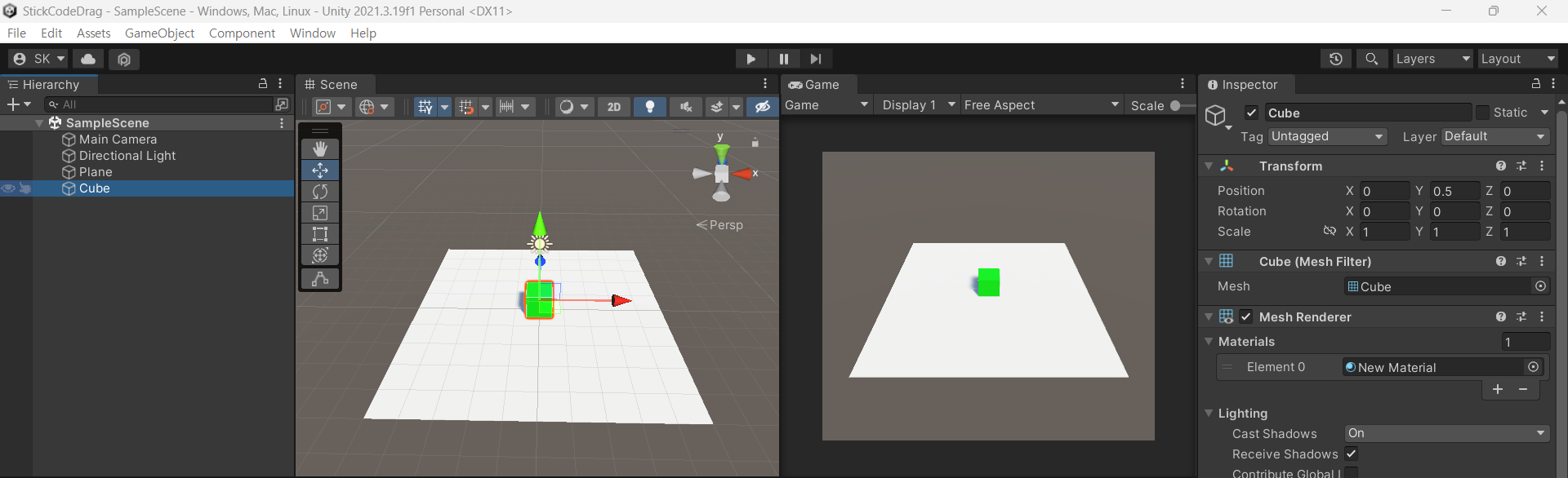 그 다음 같은 방법으로 3D Object -> Cube를 생성하고 Position (0, 0.5, 0)으로 설정해줍니다.
