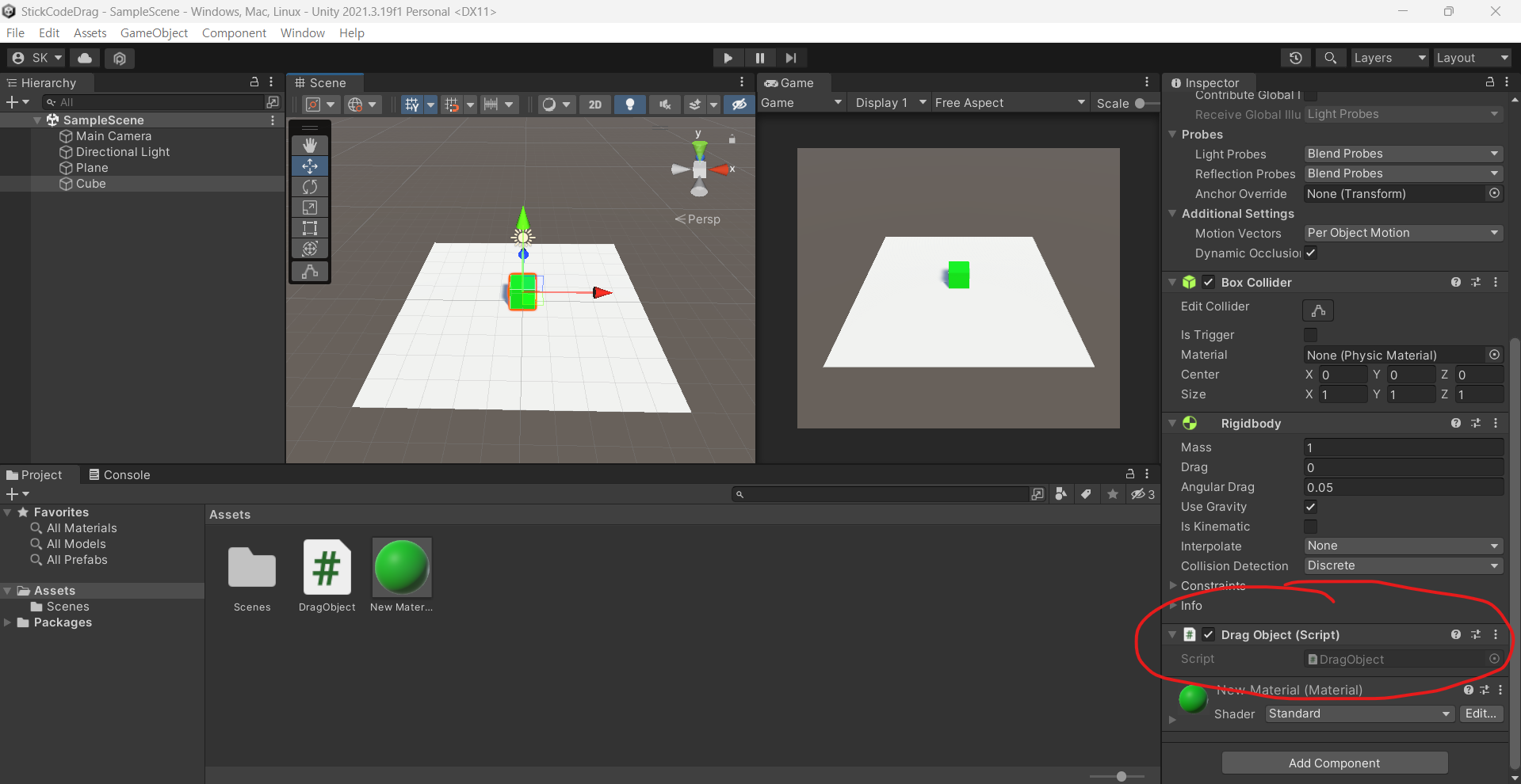 그 뒤 Project창에서 Material을 드래그해 Cube 오브젝트로 가져가면 Cube 오브젝트의 색이 변하게 됩니다.