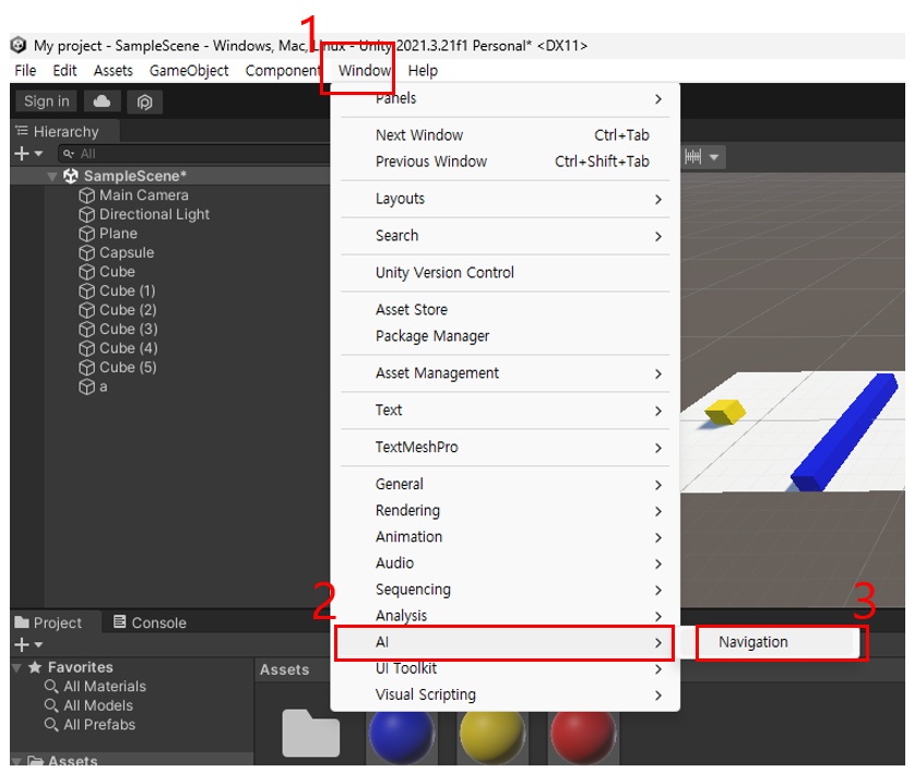 유니티 상단에 Window - > Ai -> Navigation 을 눌러주세요