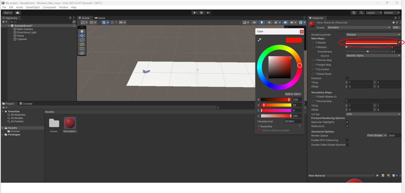 생성된 Material 를 클릭한 후 inspector 창에 있는 Albedo 속성 옆에 팔레트를 클릭하여 원하는 색상으로 변경해주세요.