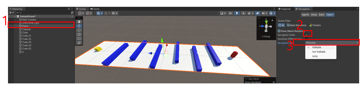 그리고 움직이는 공간인 Plane GameObject를 클릭 후 우측 Navigaition 창에서 Navigation Staic 으로 지정하고