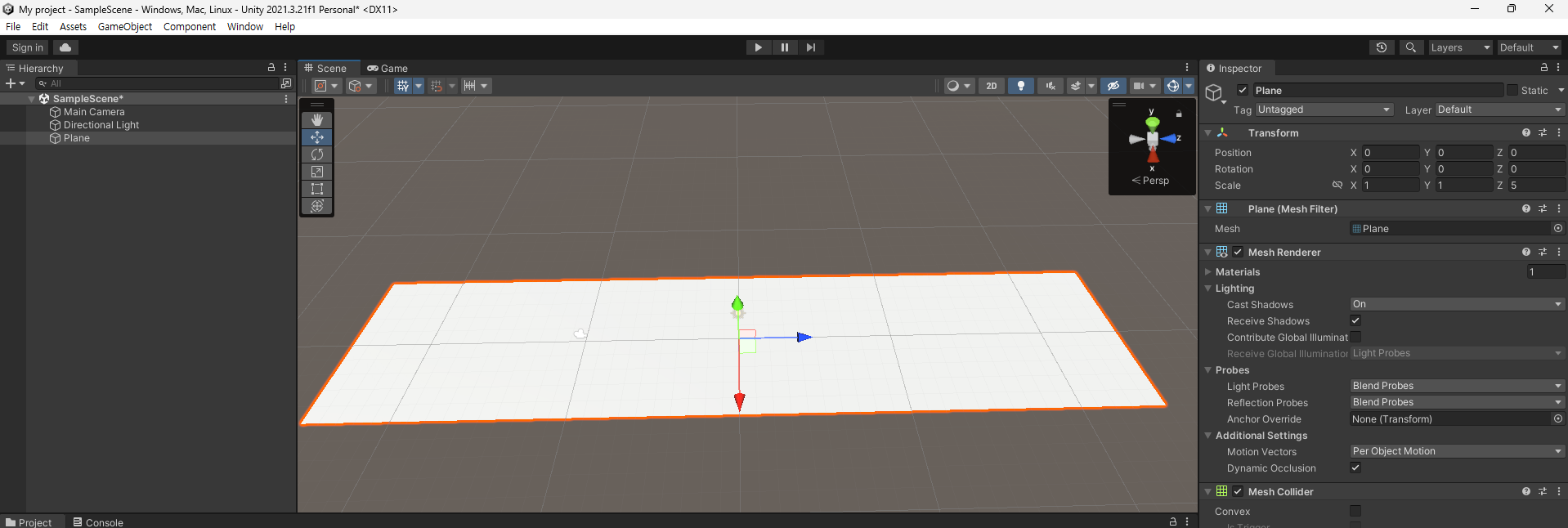 그 후 화면 왼쪽 Hierarchy창에서 마우스 우클릭을 해 3D Object -> Plane을 생성하고 Position (0, 0, 0)으로 설정 Scale(1,1,5) 으로 설정해 게임오브젝트가 움직일 수 있는 맵을 만들어 줍니다.