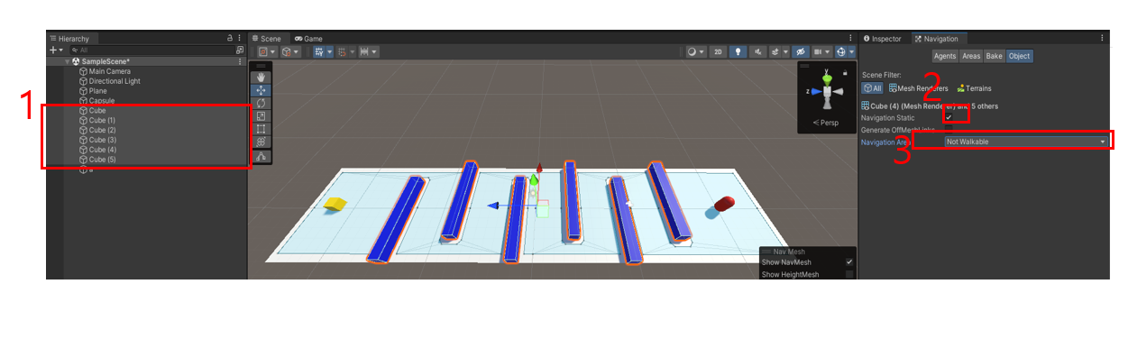 그 후에 장애물로 설정했던 GameObject들을 드래그 후 위와 같이 설정하는데 장애물 GameObject는 Navigaition Area 속성을 Not Walkable 로 설정해주셔야 합니다.