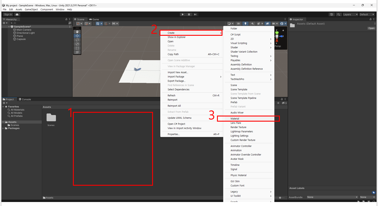 하단 Project창에서 마우스 우클릭 한 뒤 Create Material을 생성해주세요.