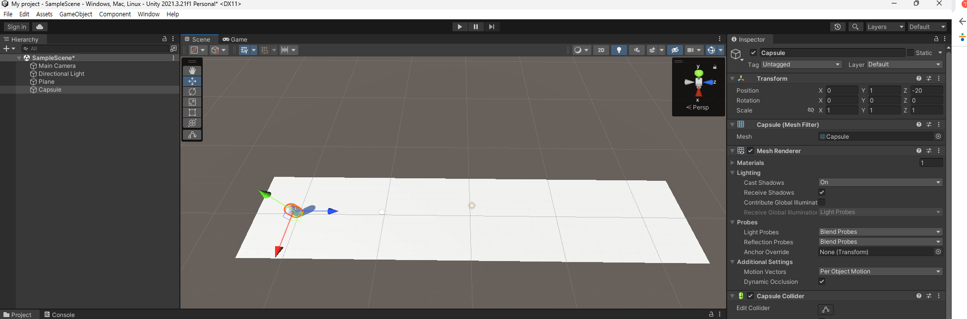 그 다음 같은 방법으로 Hierarchy창에서 마우스 우클릭을 해 3D Object -> Capsule를 생성하고 해당 Capsule의 position (0,1,-20) 으로 설정해주세요