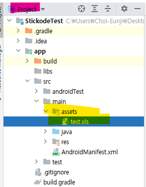 2.app->src->main 폴데어 assests 폴더 생성후 assets 폴더에 xls 파일 넣습니다.