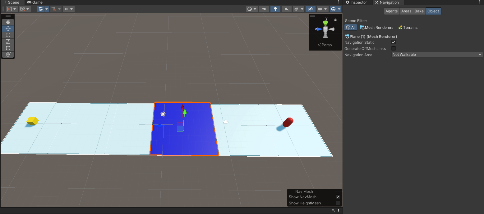 아래와 같이 캐릭터가 움직일 수 있는 지형과 구분지을 수 있도록 색을 변경하고 Navigation 에서 Navigation Area를 Not Walkable 로 설정하고 Navigation Static 을 활성화 한 후 배이크에 들어가 Bake 를 눌러주세요